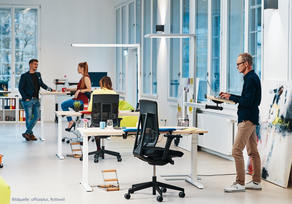 – Zwischen stehender und dynamisch sitzender Arbeitshaltung wechseln (Steh-Sitz-Dynamik), um einen erhöhten Informationsinput an die zentralmotorischen Strukturen zu generieren.